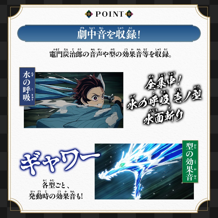 水の呼吸壱ノ型から拾ノ型に加え、劇中に登場する効果音を多数収録しています。