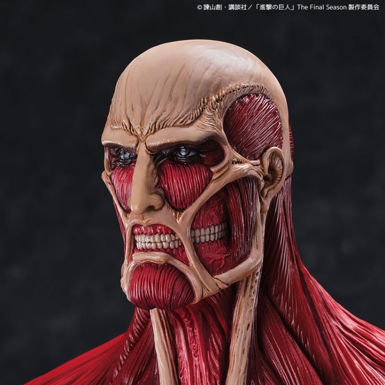 劇中では50メートルの壁の向こうからその姿を現した巨体を、全高63センチという圧巻のサイズで立体化。全身の筋繊維はこのスケールにふさわしい精密な造形で再現され、重厚な脚部、がっしりとした胴体、対照的に細身にも見える腕、見上げた際の遠近感を意識した小ぶりな頭部など、独特のプロポーションが「巨大さ」をより強調しています。