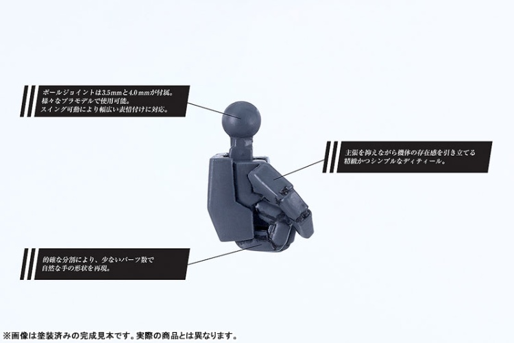 ●手首の接続用ボールジョイントは「3.5mm」「4.0mm」2種からの選択式となっており、様々なプラモデルと組み合わせることでカスタマイズの幅が広がります。