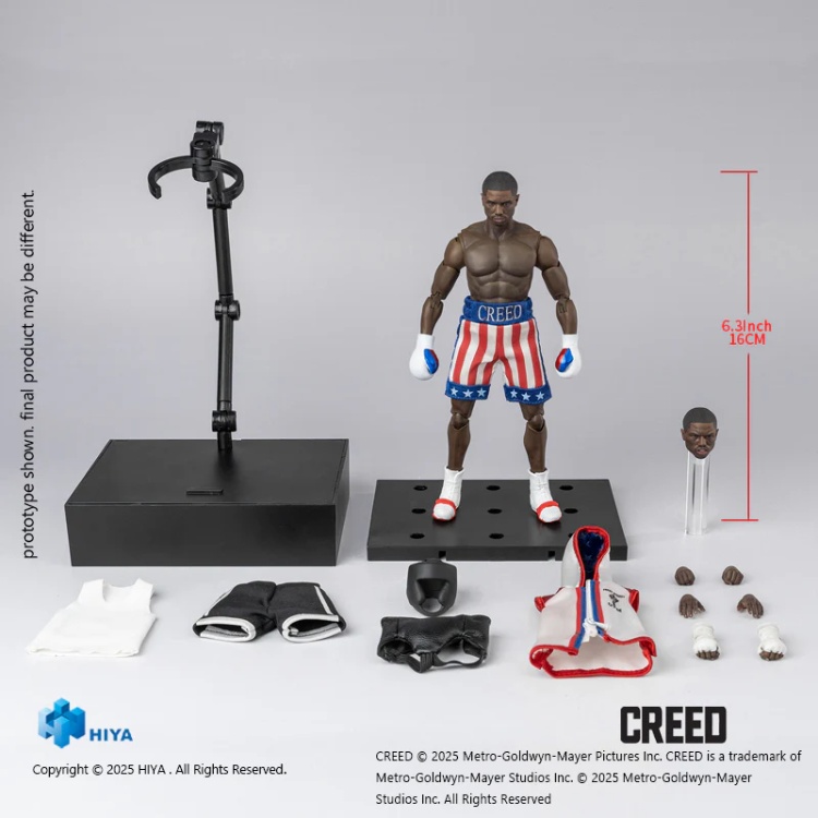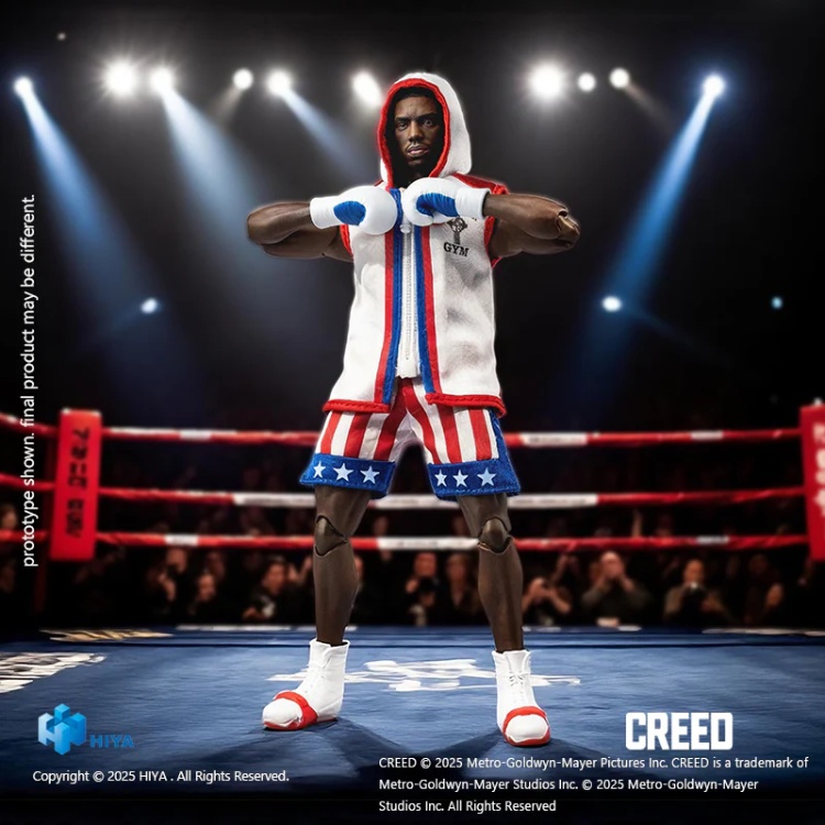 This brand new 1/12 scale action figure stands 16CM tall and faithfully recreates Adonis’s iconic appearance from the film. Featuring a serious expression and sculpted muscular physique, the figure wears star-spangled boxing trunks, paired with modern sneakers and white athletic socks—echoing the legacy of his father. The design blends classic symbolism with contemporary style, capturing Adonis’s identity as both a tribute and a new champion.