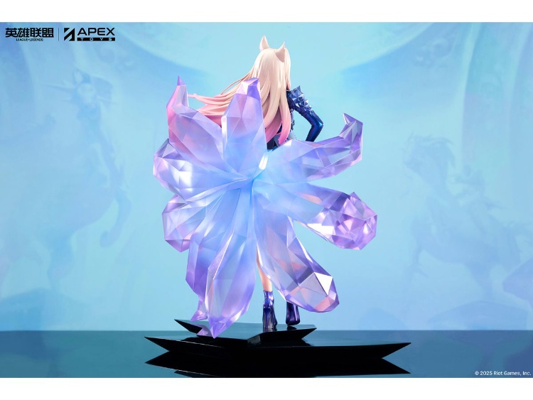 身後展開的九條尾巴大量使用透明零件製作,透過銳利的線條與纖細的邊緣表現,營造出震撼的存在感。內部複雜的光線反射與折射描繪出青紫色漸層,以夢幻的光輝更加凸顯阿狸的美麗魅力。整體造型完美融合K/DA團體的時尚風格與阿狸的妖狐特質,是兼具現代感與奇幻色彩的精彩作品。