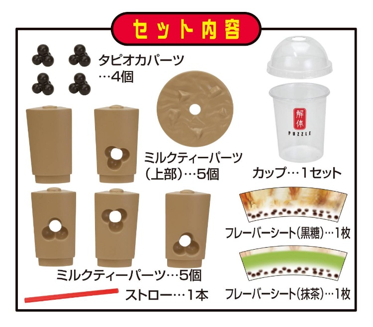 カップに、6個のミルクティーパーツと4個のタピオカパーツを入れ、正しく組み合わせるとタピオカミルクティーが完成するパズルです。