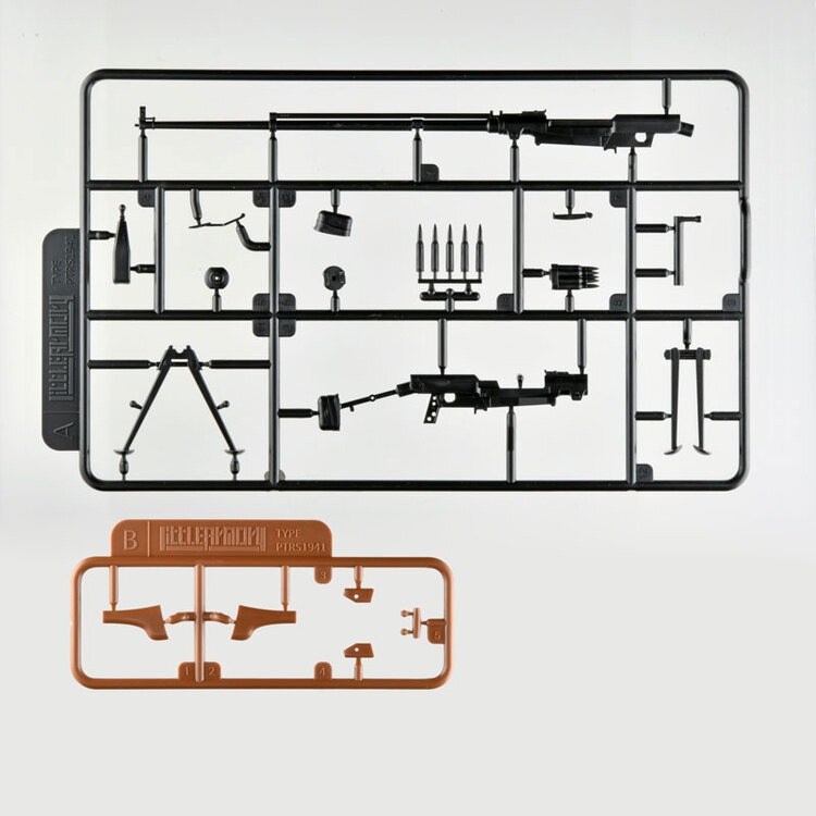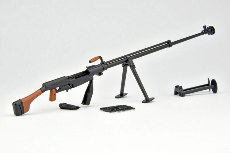 本製品は「陸上自衛隊 武器学校」の取材を通じてPTRS1941の長大な姿を1/12スケールで模型化。固定マガジン状態の選択やボルト可動など構造的な“らしさ”も再現。成型色は茶と黒の2色使用。