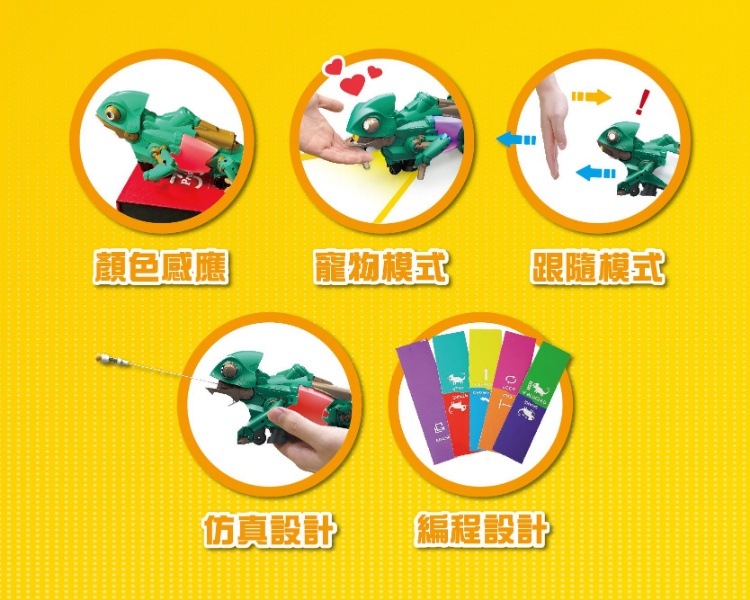 酷迪腹部的顏色感應器,可以讀取顏色並即時變色,透過三種不同的模式可以跟酷迪進行多項互動!在寵物模式中可以透過輕撫它的下巴,使其扭動身體來和你互動!切換到避障模式時遇到障礙物還會吐舌攻擊!