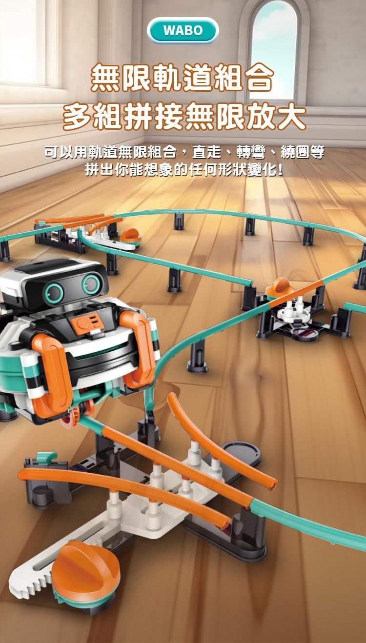 超好玩的 Wabo軌道平衡機器人,親子同樂組裝,軌道有三種機關變換,可多組軌道組合,也可以在不同物品上平衡行走。