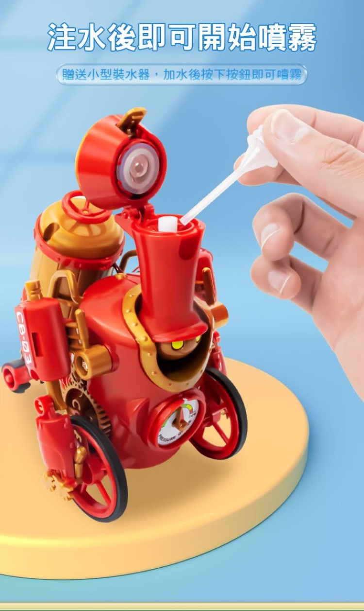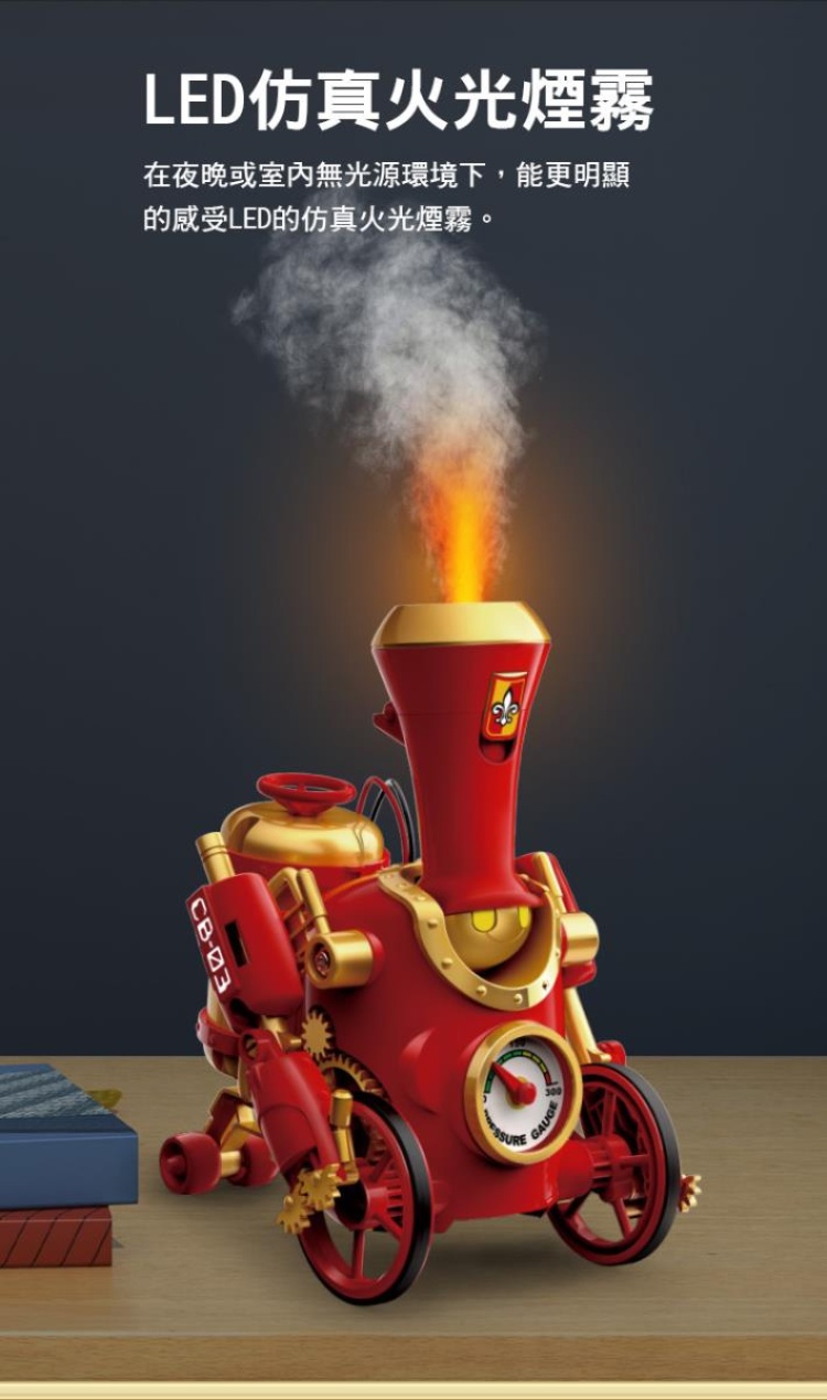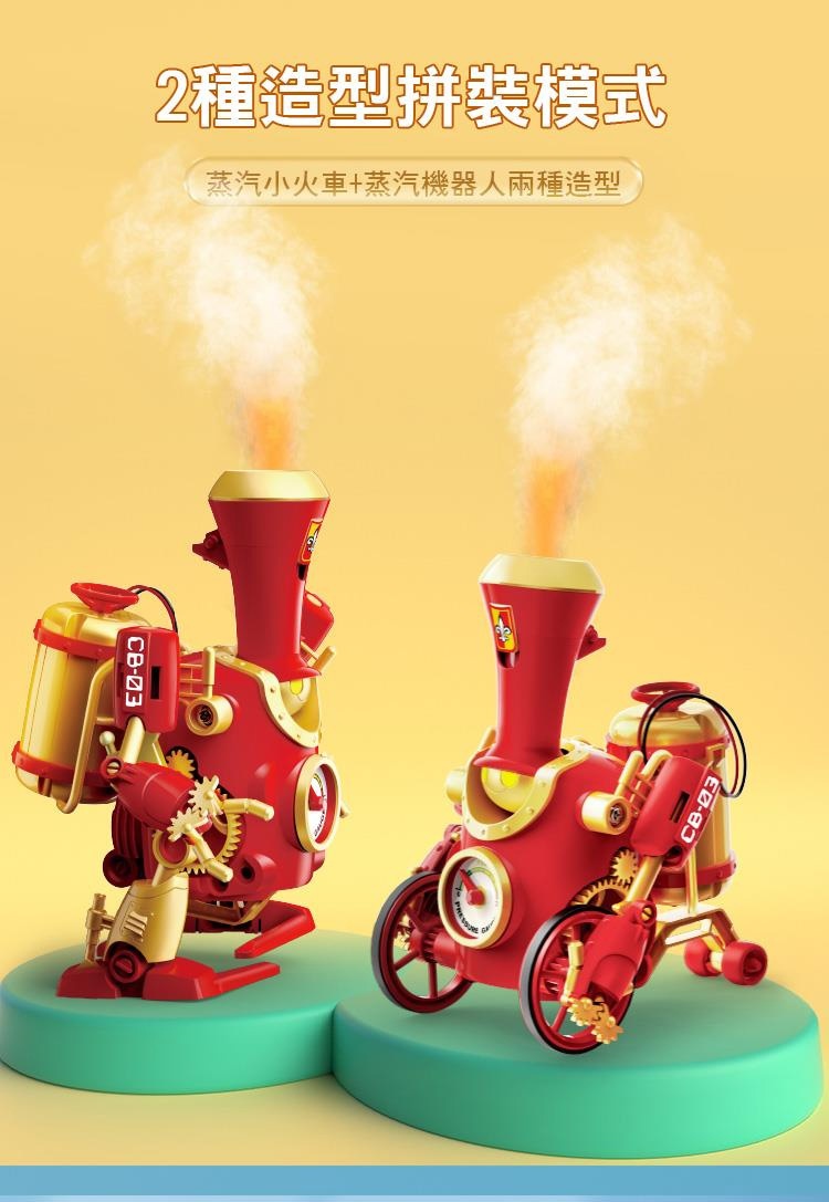 雙造型自由拼裝:蒸氣機器人 X 蒸氣小火車. 3種不同仿真火光煙霧,組裝創意自由發揮!