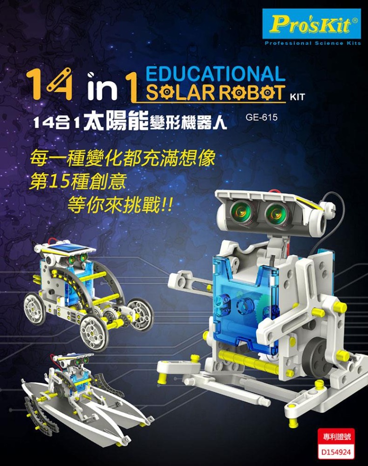 通過ST安全玩具認證,100%台灣製造安全無慮,透過模型機構設計,可組裝14種變化,可學習到太陽能轉電能原理及動力機械力學原理。