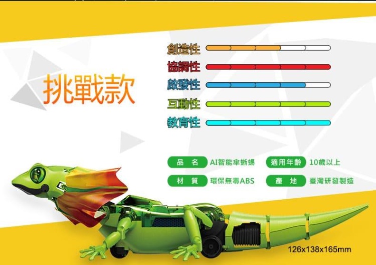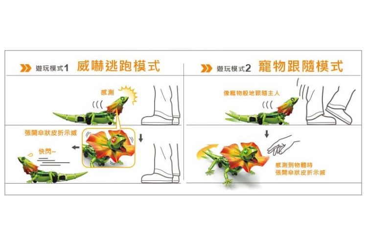 AI智能傘蜥蜴是紅外線感測的模型玩具,具有”逃跑”與”跟隨”二種互動模式。仿生傘蜥蜴,動作逼真逗趣,有紅外線感應+AI人工智慧,互動效果十足。