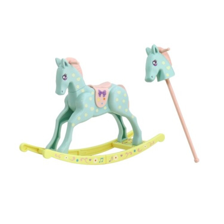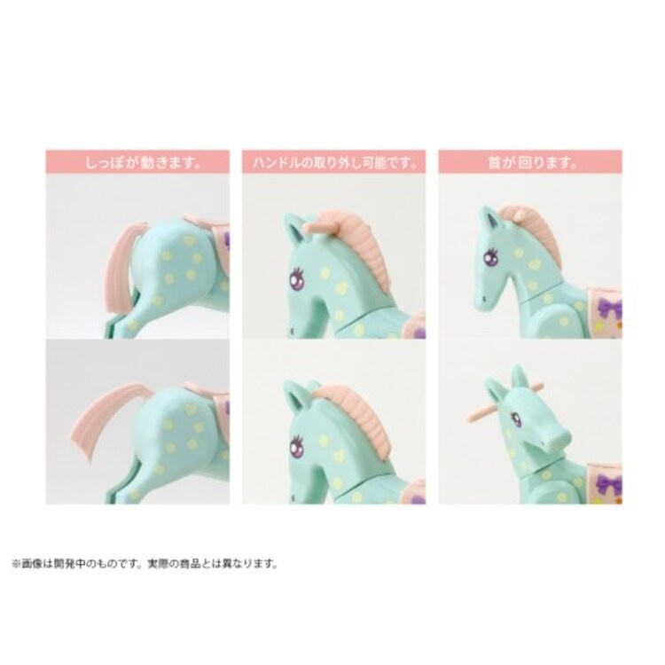 また、頭を外し、付属の棒をつければ「スティックホース」にして遊ぶことも可能です。 女の子フィギュアが乗ってもかわいいカラフルなメルヘンカラーのデザインです。