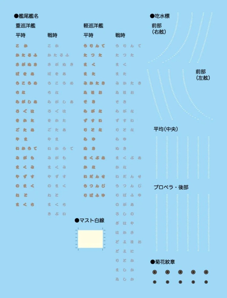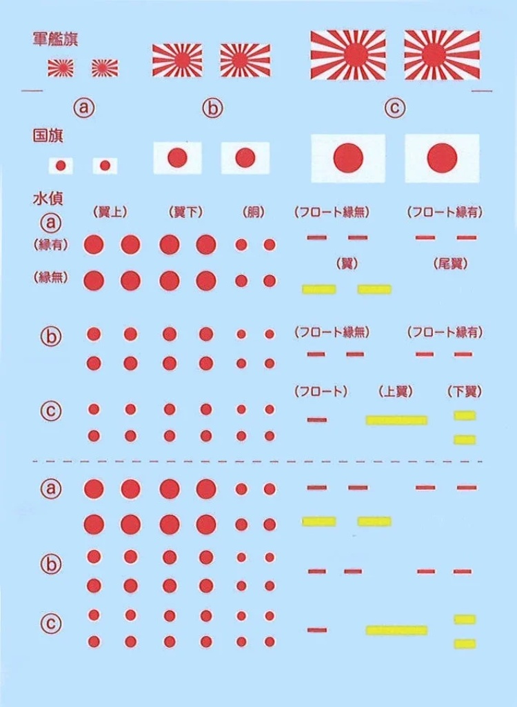 →艦載機の日の丸、味方識別帯(黄帯)などを収録し、日の丸は大戦後期の白縁がないものも含みます