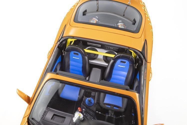 Order型號比例 材質 能動機關座艙內部採用藍色麂皮重新包覆,與儀表台上配有超轉燈的大型Auto Meter 轉速表相得益彰。