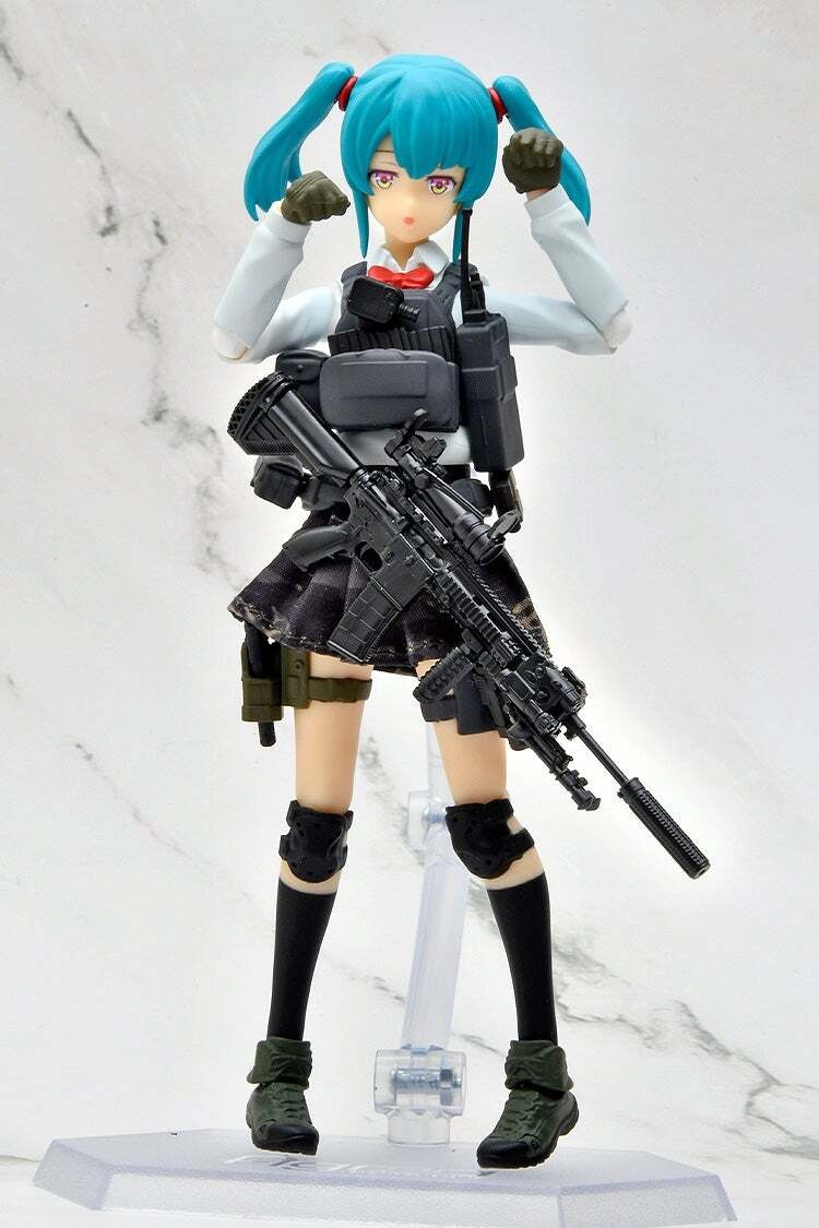 本商品為軍事女高中生系列作品「Little Armory」的武裝JK無名角色D的新造型。本次作品採用以黑色為基底的裝備零件和迷彩圖案的布製裙子。黑色裝備是以威嚇效果和夜間低可視性為目的,主要由特殊部隊愛用的配色。武裝JK Variant「D」是一種防彈套裝配備,搭配短髮雙馬尾角色、裝甲板以及戶外鞋。髮色和眼睛顏色也有所變更,可與過去發售的商品替換組裝,敬請帶回家賞玩吧。附自動手槍「CZ75型」,可收納於附屬的槍套中。