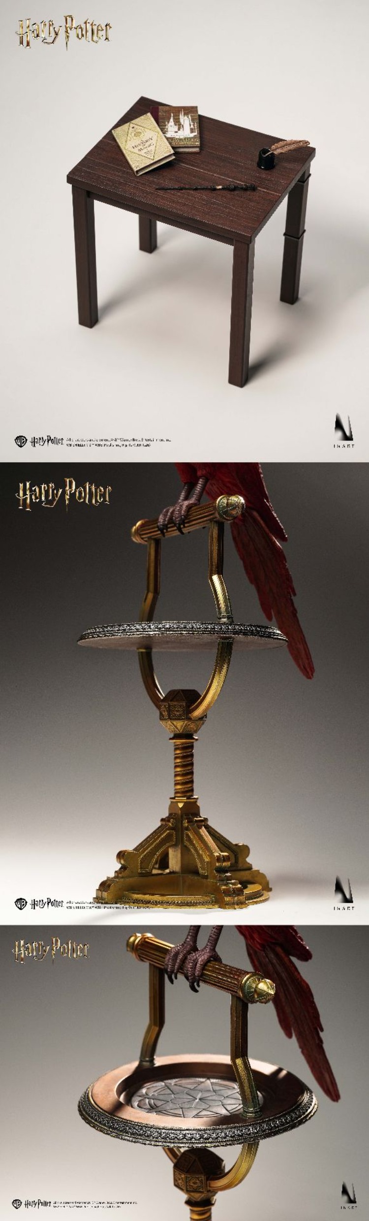 配件:INART可動素體*1、磁吸可動眼植髮植鬍頭雕*1、巫師袍*1套、眼鏡*1、巫師帽*1、放鬆手手型*1對、指向手手型*1對、攤開手手型*1對、右持魔杖手型手型*1、右持劍手型*1、鳳凰*1、鳳凰支架*1、接骨木魔杖*1、葛萊分多寶劍*1、書本*2、羽毛筆*1、墨水瓶*1、桌子*1、金屬支架*1、地台*1