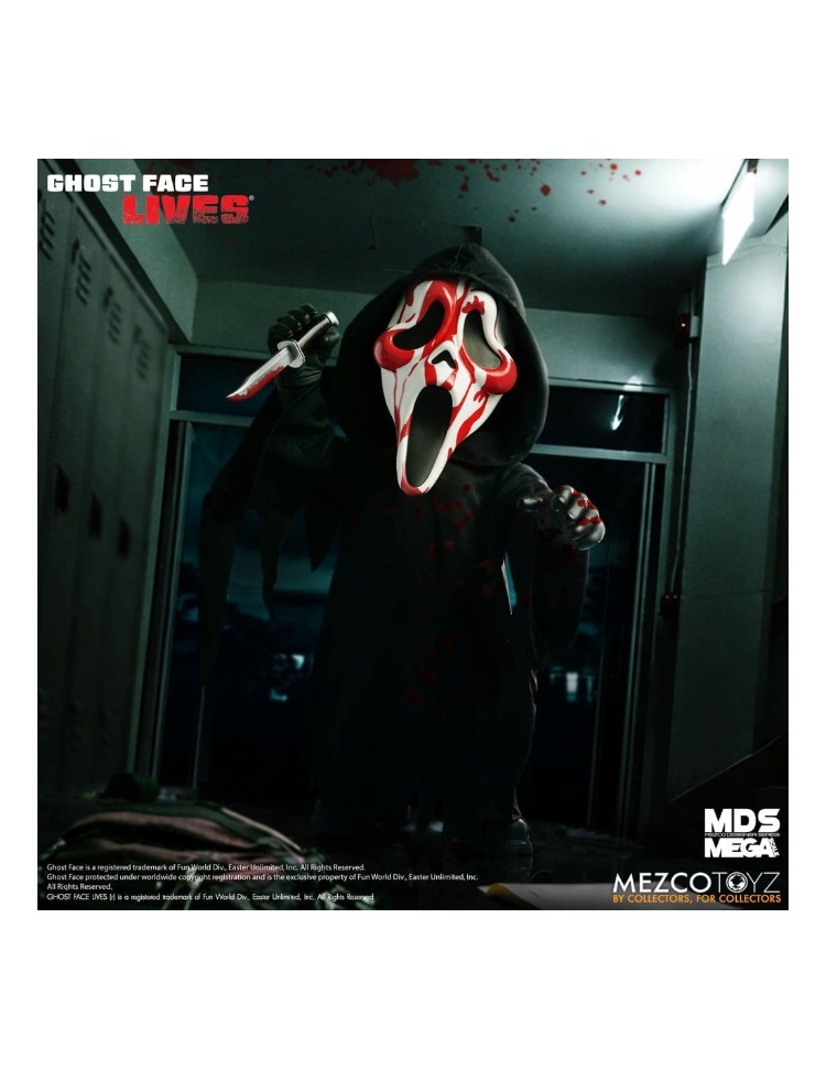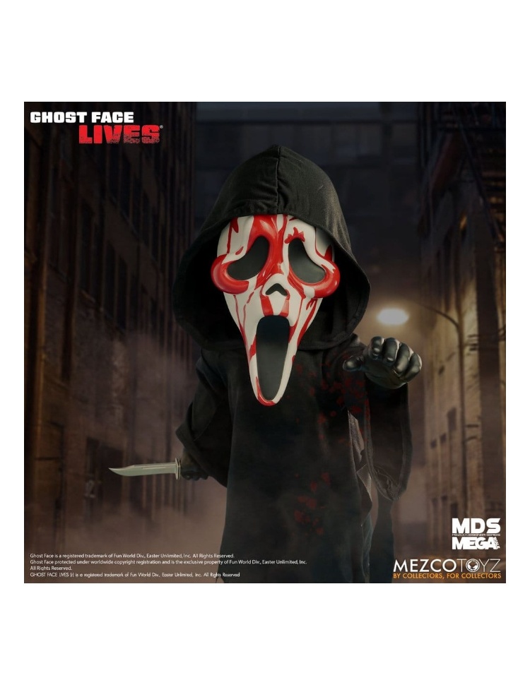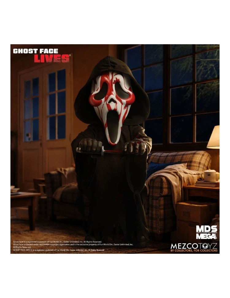 鎖好門窗!大事即將發生-鬼臉強勢回歸,闖入你的收藏!臭名昭著的鬼臉再次現身,渾身浴血,準備讓你的收藏架陷入恐慌。這款血腥版鬼臉身穿標誌性的兜帽長袍,戴著面具,上面沾滿了最新一次殺戮的血跡。他配備了標誌性的獵刀,牢牢地握在他的右手中。這款令人膽寒的 15 英寸高模型擁有 11 個可動關節,可擺出各種動態致命的姿勢。 MDS 超大比例血腥鬼臉採用收藏家友善的櫥窗包裝盒,是完美的展示品。