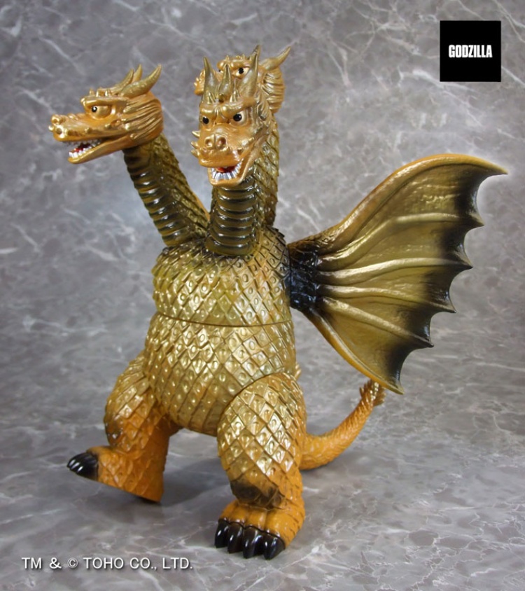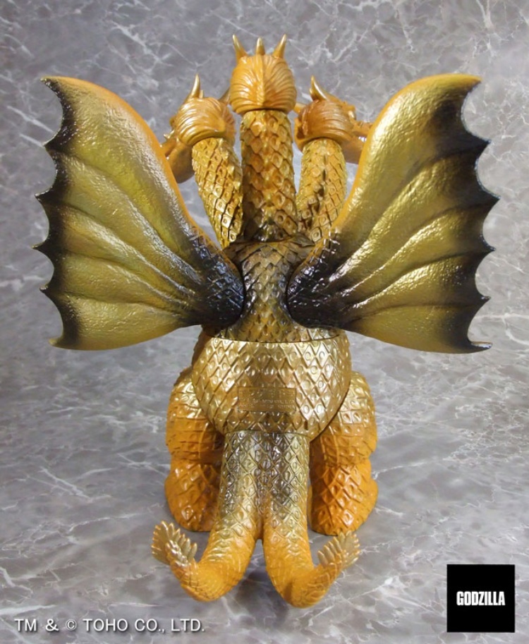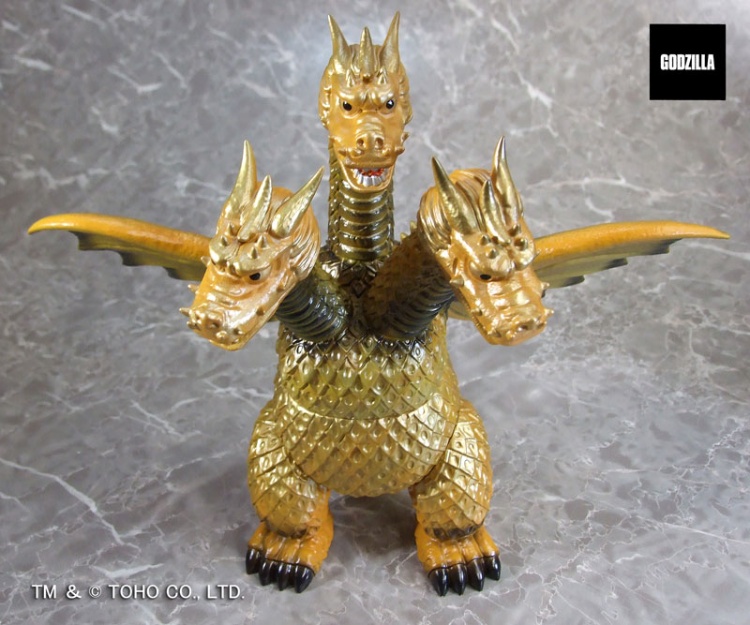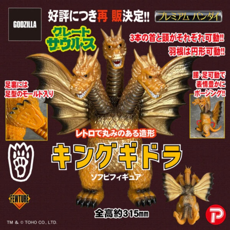 作為哥吉拉70週年紀念計畫的一部分,經典的哥吉拉軟膠模型「巨龍哥吉拉」於2024年採用全新模具忠實再現。同系列的王者基多拉,擁有三個頭、三個脖子、兩條長尾巴、全身覆蓋金色鱗片、兩條粗壯的腿以及一對用於飛行的巨大翅膀,以王者基多拉系列中復古圓潤的造型全新打造。其尺寸與龍系列相同!可與另售的龍哥吉拉一起展示!可動關節:頸部、頭部、腰部、腿部、翅膀(環形關節)。腳底印有原版巨龍哥吉拉的腳印。