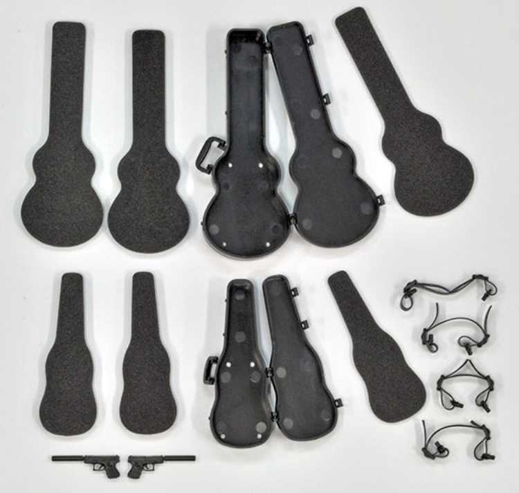 本套件包含兩種類型的盒子:一種是適合中型步槍的吉他盒,另一種是適合衝鋒槍的小提琴盒。內部使用不同厚度的聚氨酯材料。除了可移動提把外,還附有一條橡皮筋背帶。