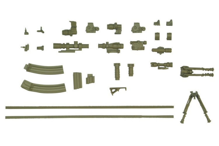 本套裝包含適用於使用「皮卡汀尼導軌」標準的M4卡賓槍的瞄準鏡、戰術手電筒及其他配件。
